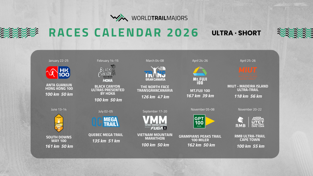 La série débutera le 22 janvier avec l’Anta Guanjun Hong Kong 100, suivie de la Black Canyon Ultras présentée par Hoka. Début mars, la série arrive en Europe avec la The North Face Transgrancanaria, avant un week-end de trail de très haut niveau avec le doublé Mt. FUJI 100 et MIUT – Madeira Island Ultra-Trail. En mai, cap sur le Royaume-Uni pour la South Downs Way 100, puis début juillet sur le Québec Mega Trail au Canada.