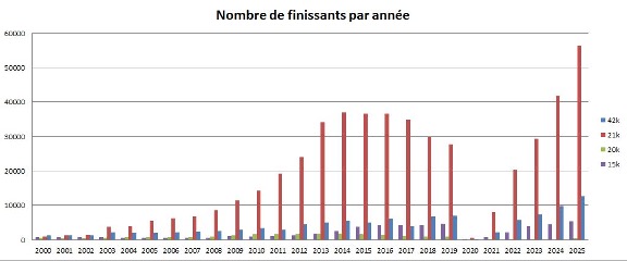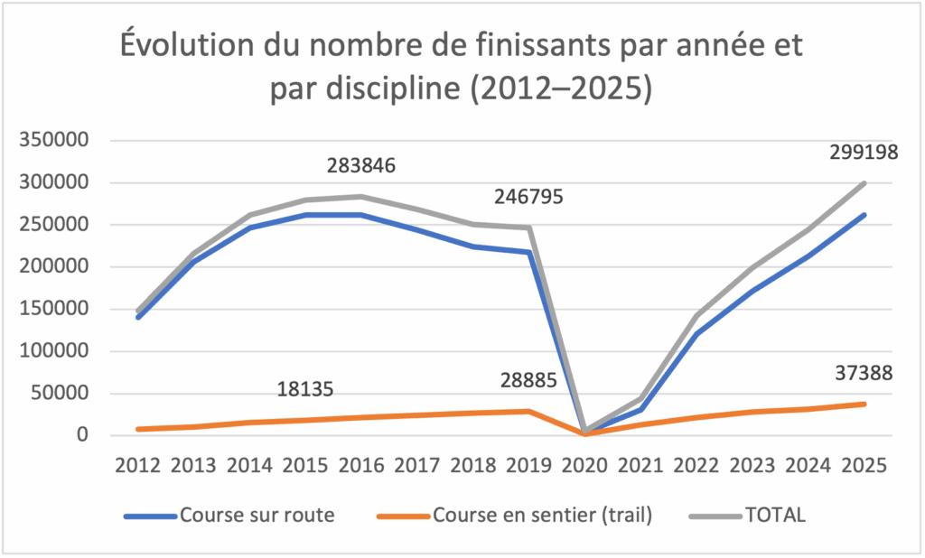 Enfin, le troisième graphique met en lumière un autre phénomène marquant : un nombre record de finissants sur les longues distances, notamment au demi-marathon et au marathon. Tous événements confondus, on dénombre 12 560 marathoniens en 2025, soit une hausse de près de 30 % par rapport à 2024 (9 757) et plus du double comparativement à 2016 (6 056). Même tendance au demi-marathon, avec 56 273 finissants en 2025, contre 36 947 lors du précédent pic en 2014. Cet engouement pour les longues distances se reflète également dans le trail, où plusieurs distances enregistrent eux aussi des records de participation.