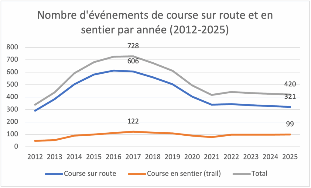 Le second graphique met toutefois en évidence un phénomène surprenant : malgré le rebond de participation en course sur route et en trail, le nombre d’événements capables d’accueillir ces coureurs enthousiastes est nettement inférieur à ce qu’il était auparavant. C’est probablement ce qui explique pourquoi tant d’événements affichent complet aujourd’hui, plusieurs mois à l’avance : l’offre est inférieure à la demande ! Concrètement, le nombre total d’événements de course à pied a chuté de plus de 40 % depuis 2017, passant de 728 à 420, tandis que le nombre de participants en quête d’objectifs continue de croître. Cette chute semble principalement due à la diminution des événements de course sur route, tandis que ceux du trail sont demeurés relativement stables.