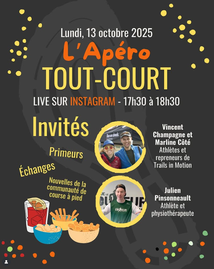 Lors de cet Apéro Live sur Instagram, nous recevrons Julien Pinsonneault, athlète et physiothérapeute propriétaire de la Clinique Le Coureur Maskoutain, ainsi que Vincent Champagne et Marline Côté, athlètes et repreneurs de la série Trails in Motion. Évidemment, ces trois invités ont toujours plein de beaux projets en tête, alors ce sera intéressant de les entendre! Puis, comme toujours, on te donnera des nouvelles des projets TOUT-COURT, de la communauté de course à pied et des primeurs.